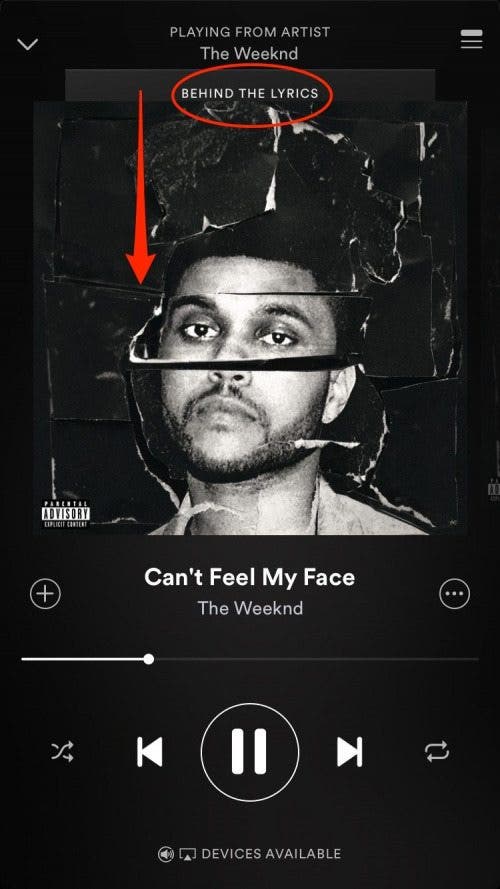 - 如果该歌曲可以选择 Genius,您将在顶部附近看到“Behind the Lyrics”。