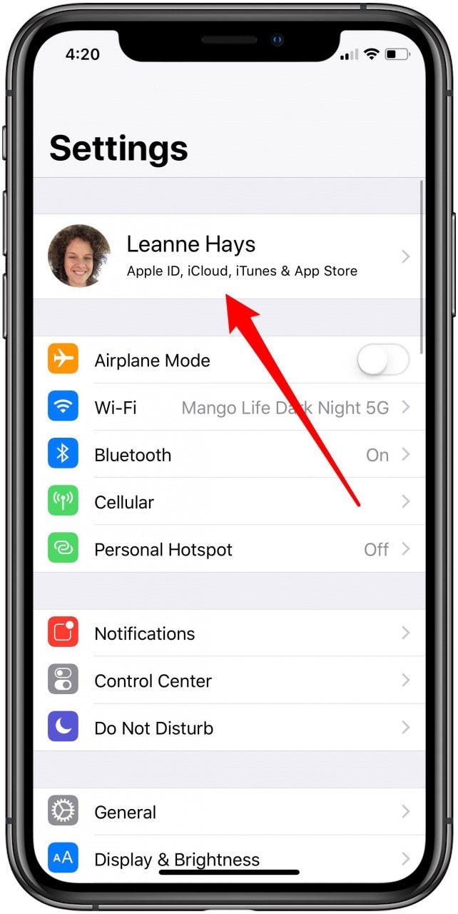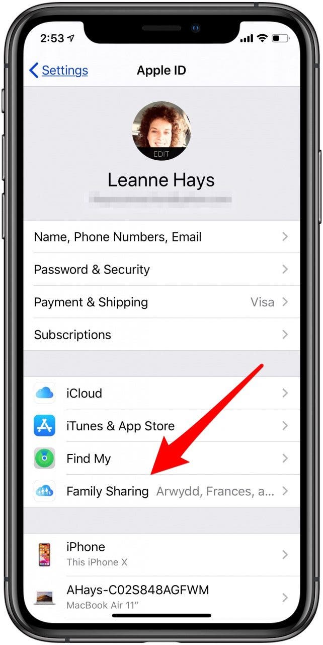- 打开设置应用程序,然后点击您的名字横幅在顶部,并且家庭共享再次。