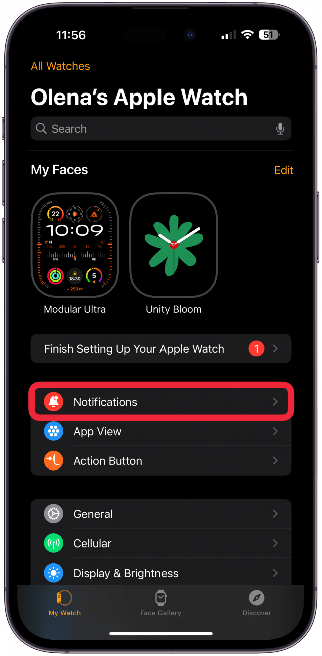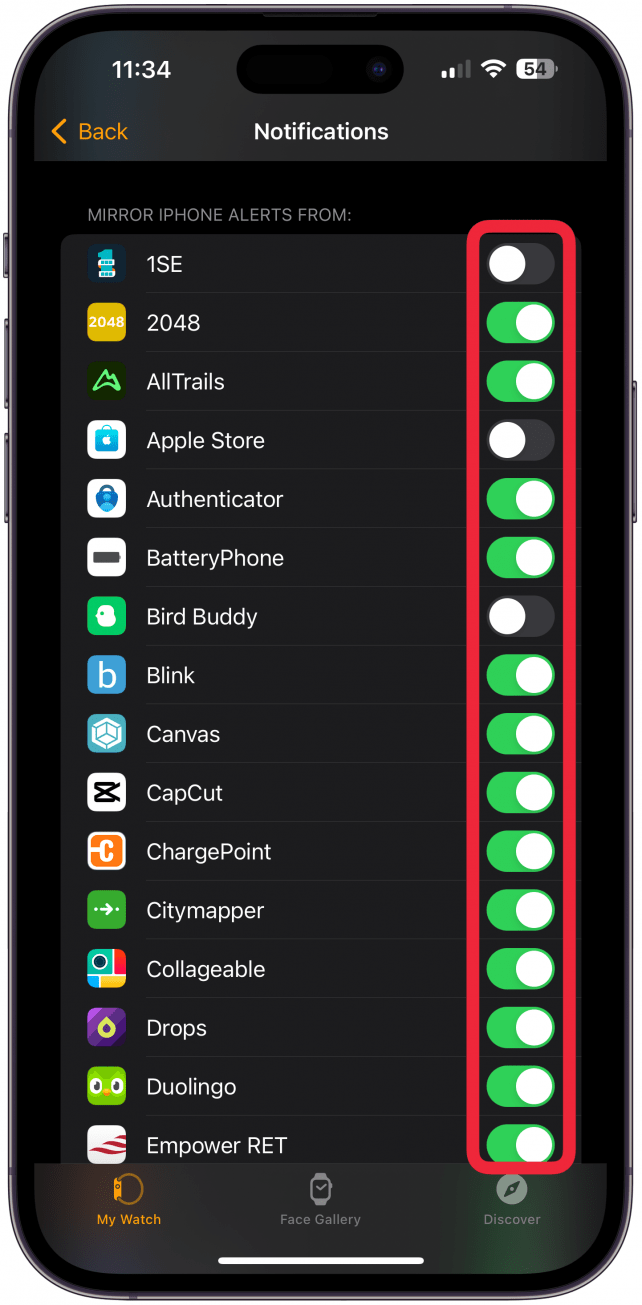 额外的通知不仅浪费您的时间,而且还会浪费您的时间。它们还会缩短 Apple Watch 的电池寿命。即使您从 Apple Watch 中删除应用程序,只要您打开了“镜像 iPhone 警报”功能,您仍然会收到来自 iPhone 的通知。要关闭不必要的通知并减少 Apple Watch 电池消耗: