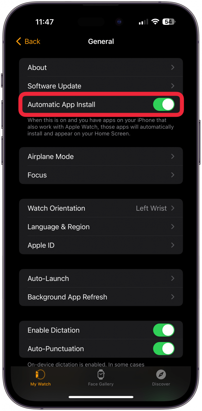 当您在 iPhone 上下载应用程序时,如果该应用程序有 Apple Watch 版本,它会自动下载到 Apple Watch。设备之间的这种通信会消耗电池电量。关闭自动下载以节省电池电量,而是在“我的手表”选项卡中手动添加您想要在 Apple Watch 上看到的应用程序。要关闭 Apple Watch 上的自动下载: