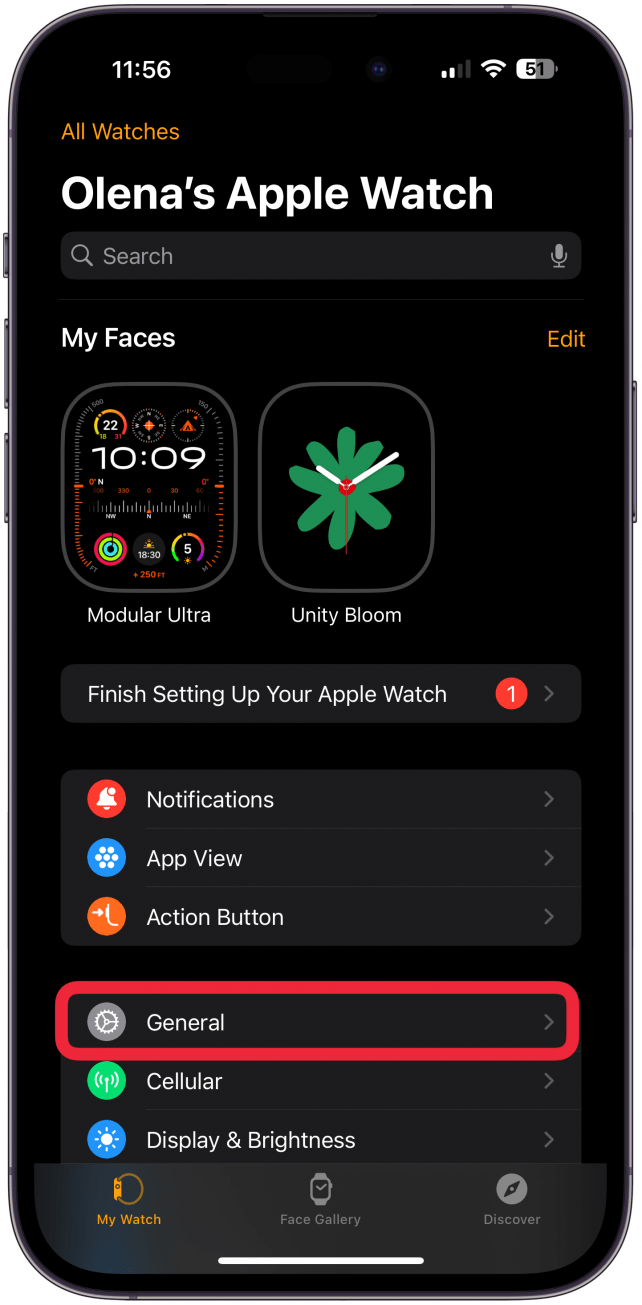 - 打开 iPhone 上的 Watch 应用,并确保您位于“我的手表”选项卡上。然后,选择常规。