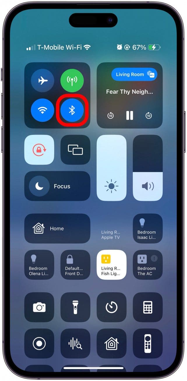 打开 iPhone 上的控制中心,然后点击蓝牙图标将其关闭。等待一两分钟,然后再次点击它以将其重新打开。您的 AirPods 应该会自动连接,问题可能会得到解决!
