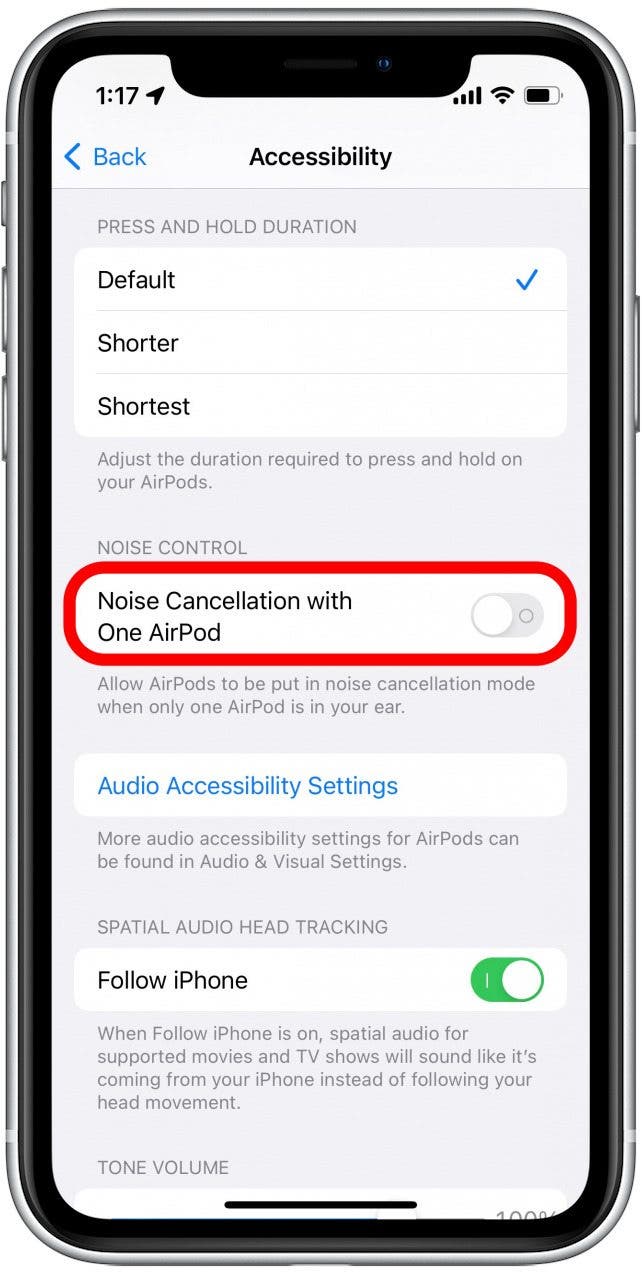 但是,如果您希望在单个 AirPod 上使用主动降噪功能,Apple 提供了打开它的选项。以下是仅使用一只 AirPods 时打开降噪功能的方法: