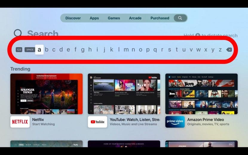 - 从这里,您将能够使用 Apple TV 遥控器上的触控板左右滚动,点按字母拼出您要查找的应用程序。您还可以选择或者按 Siri 遥控器上的麦克风图标并进行语音搜索。如果您遇到问题。