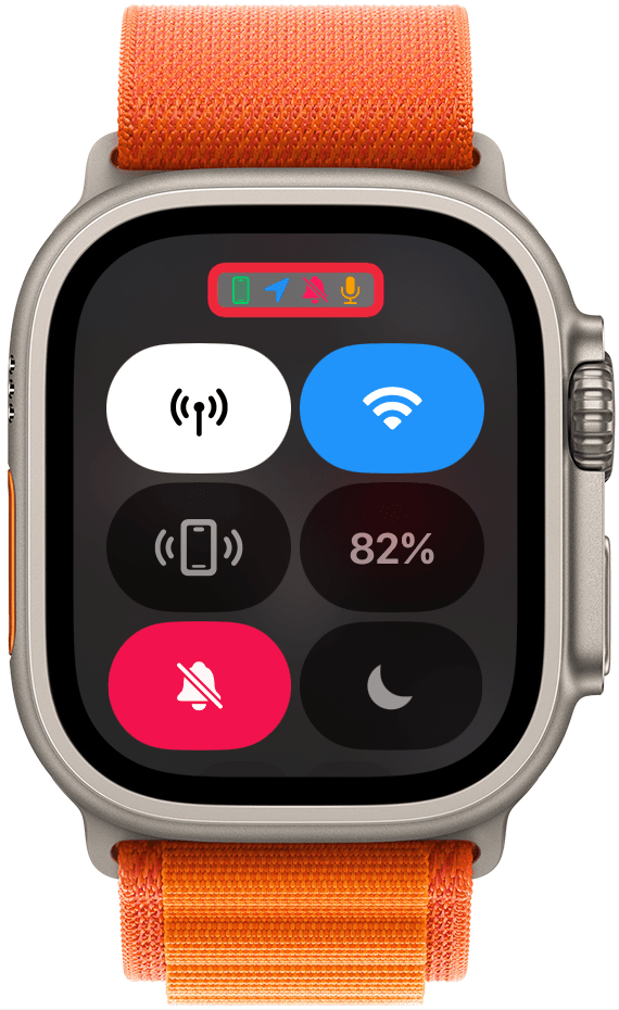 在 Apple Watch 控制中心的顶部,您会看到小图标。您可以点击这些来获取有关每一项含义的更多信息。这些状态图标可以让您一目了然地知道飞行模式或剧院模式是否开启、手表是否静音、应用程序是否正在使用您的位置、您的 iPhone 是否已连接等等。