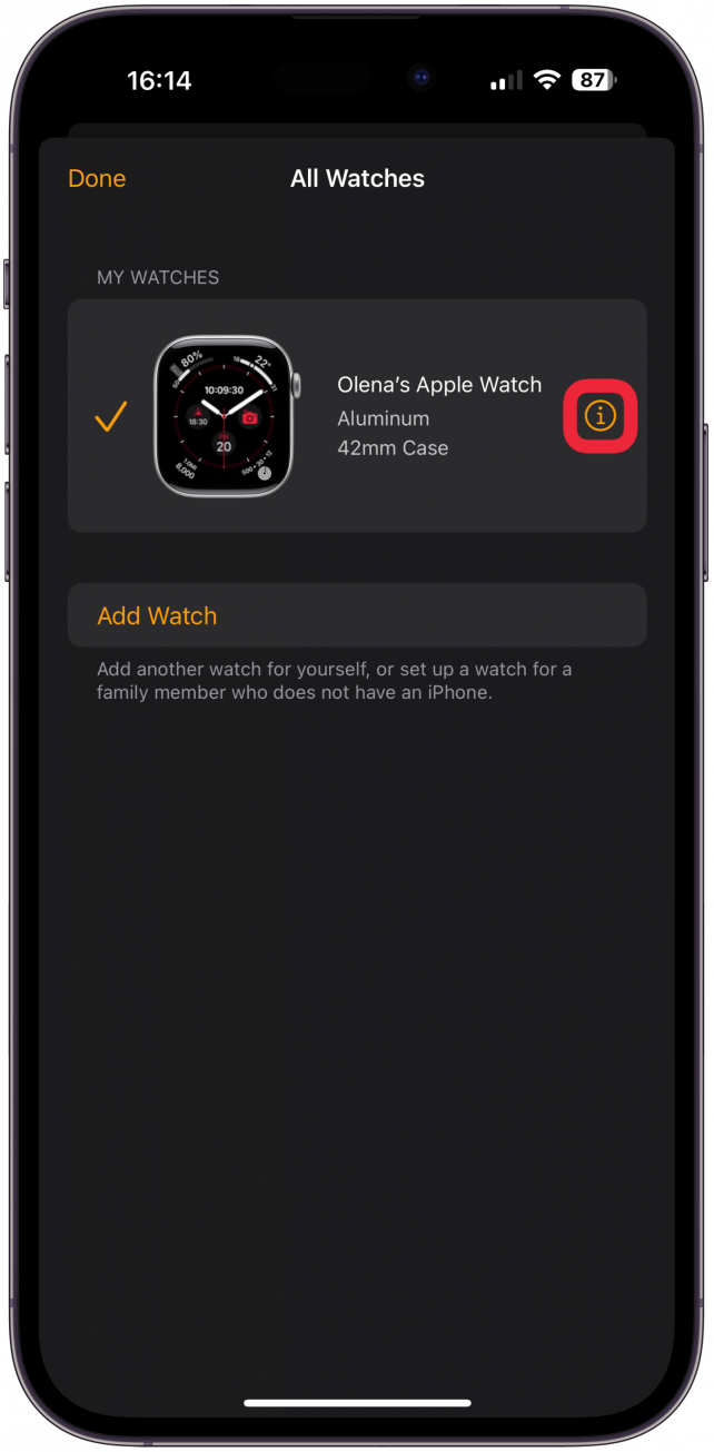 - 点击信息图标位于您想要取消配对的手表旁边。