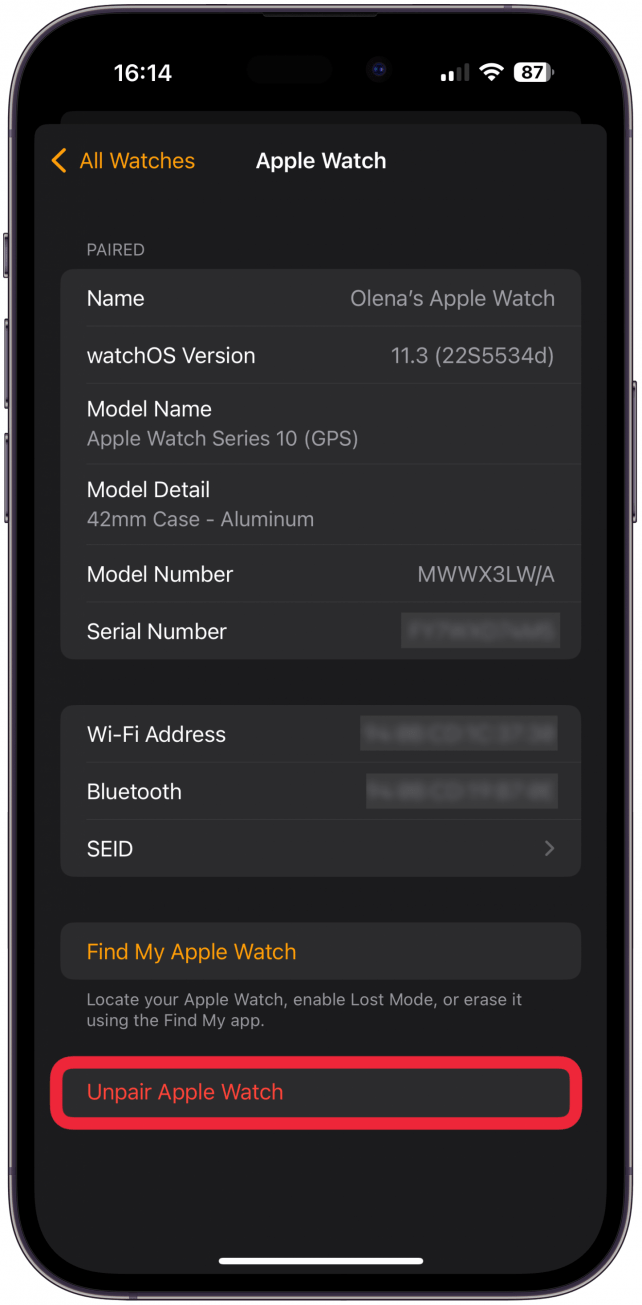 - 轻敲取消 [姓名] Apple Watch 的配对取消配对。