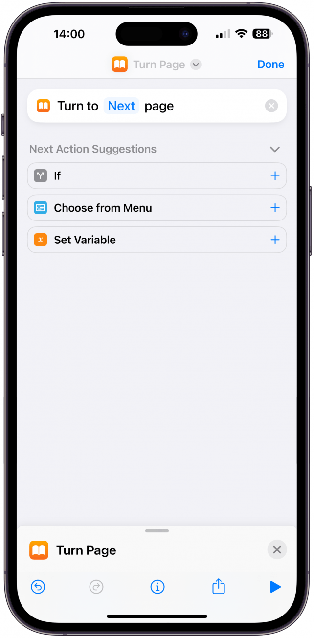 大多数电子阅读器(例如 Kindle 或 Nooks)都有一个指定的按钮可以翻到下一页。但当您在 iPhone 上阅读时,您必须滑动或点击才能进入下一页。为此,您需要创建一个新的快捷方式并添加名为“下一页”的操作。然后,您在操作按钮设置中选择快捷方式并选择新的快捷方式。下次您在“图书”应用程序中阅读时,可以按“操作”按钮翻至下一页。