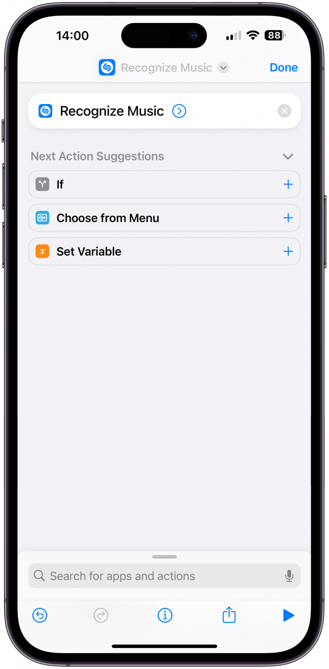 如果您已经下载了免费的Shazam:音乐发现应用程序,那么您已经知道它是如何工作的。 Shazam 是在快捷方式应用程序中提供操作的第三方应用程序之一。要添加 Shazam 快捷方式,您只需在“快捷方式”应用程序中添加“识别音乐”即可。然后在“操作”按钮设置中选择此快捷方式,您将能够谨慎地点击该按钮并获取有关正在播放的歌曲的信息,而无需打断您的对话或打扰您周围的任何人。