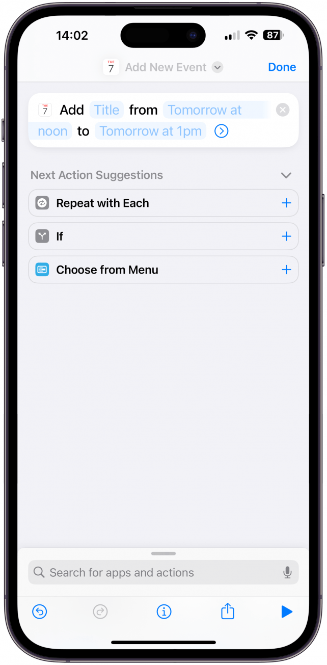 如果您想使用日历应用程序掌握您的日程安排和职责,那么您需要这样做。打开日历应用程序、添加新事件并输入所有详细信息可能需要一些时间。在途中,您可能会看到一封电子邮件、消息或社交媒体通知,这些通知可能会让您无法完成手头的任务。相反,创建一个“创建新事件”快捷方式并在“操作”按钮设置中选择它。现在,您可以安心地添加新事件,而无需解锁手机并分心。