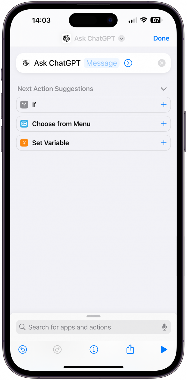 ChatGPT 是人们使用人工智能获得问题答案或学习新事物的新方式。下载免费的聊天GPT应用程序并创建一个 Ask ChatGPT 快捷方式。然后,您可以在操作按钮设置中选择此快捷方式。 ChatGPT 的使用方式与 Google 类似,但您可以输入更复杂的提示,并根据数千个互联网结果获得量身定制的建议,而手动阅读这些结果需要花费数小时。
