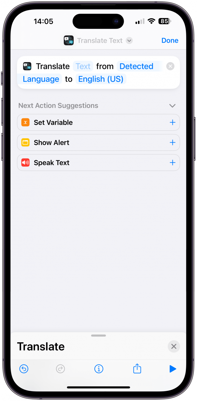 旅行是我最喜欢的爱好之一,但语言障碍会让出行变得更加困难。要加快翻译速度,请创建翻译文本快捷方式。在操作按钮设置中选择此快捷方式,以便您可以按下按钮并立即跳转到翻译!我希望当我在国外生活在中国时,我的 iPhone 上就有这个功能;这是我最喜欢的 iPhone 快捷方式创意之一。