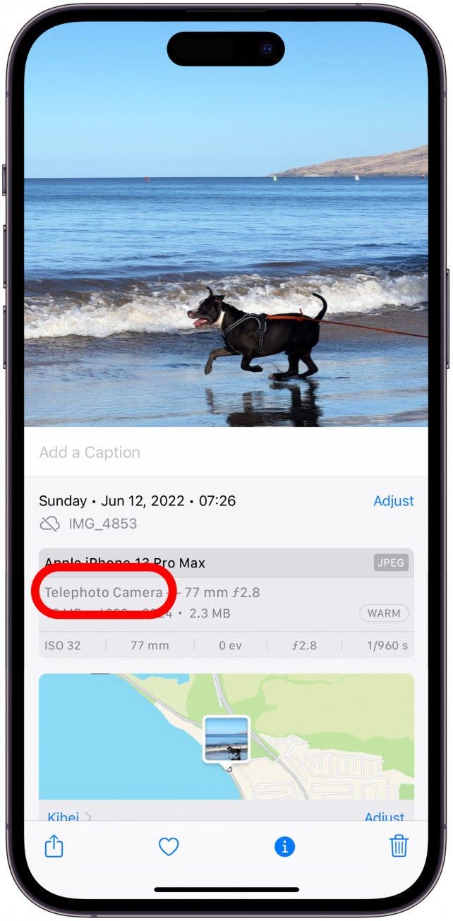 - 您将在照片的详细信息中看到您的 iPhone 型号名称下使用的镜头。