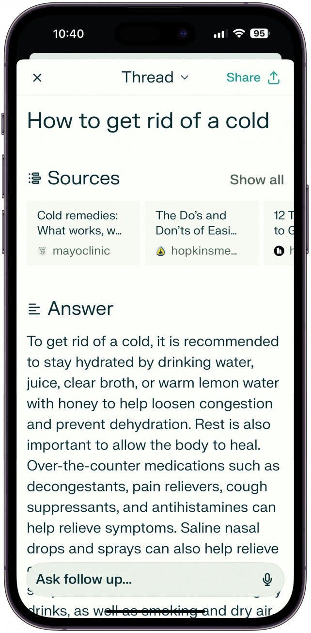 Perplexity iPhone 应用程序是一款由人工智能驱动的对话式搜索引擎,可通过最新来源提供任何主题的即时答案和信息。该应用程序用户友好,界面简单,可在 App Store 上免费下载,为寻求任何主题的准确、智能答案的用户提供无缝体验。它还有一个小部件,我觉得很方便。