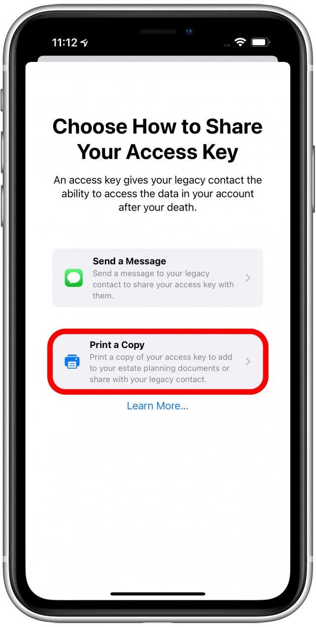 - 您可以选择打印副本以便您可以打印并添加解锁 Apple ID 的密钥到您的遗产规划文件和/或生前遗嘱中。