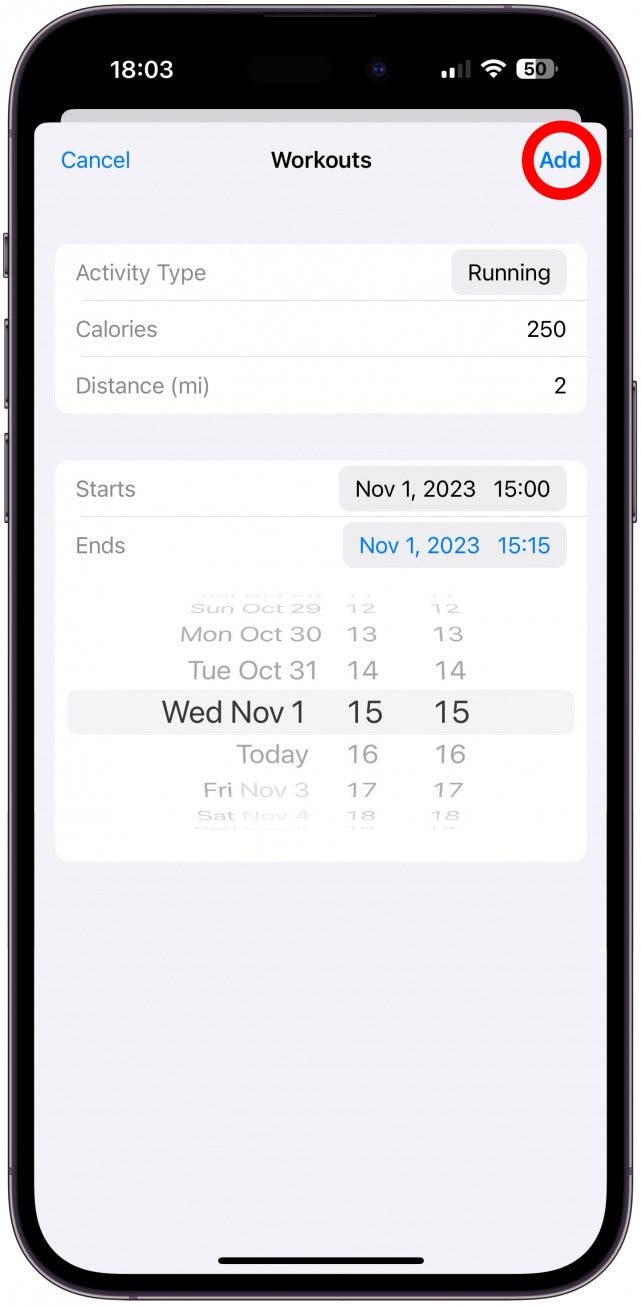 - 要在开始锻炼前设置时间、距离或卡路里,请点击三个点。