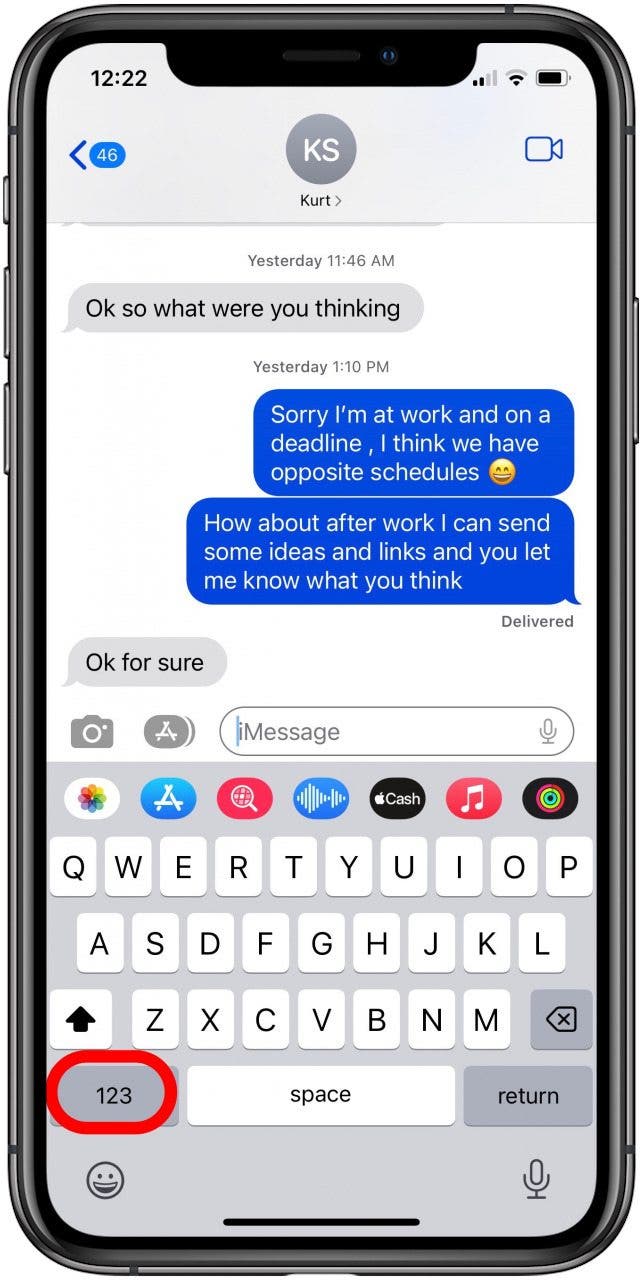 - 点击文本字段以调出键盘,然后点击123按钮。