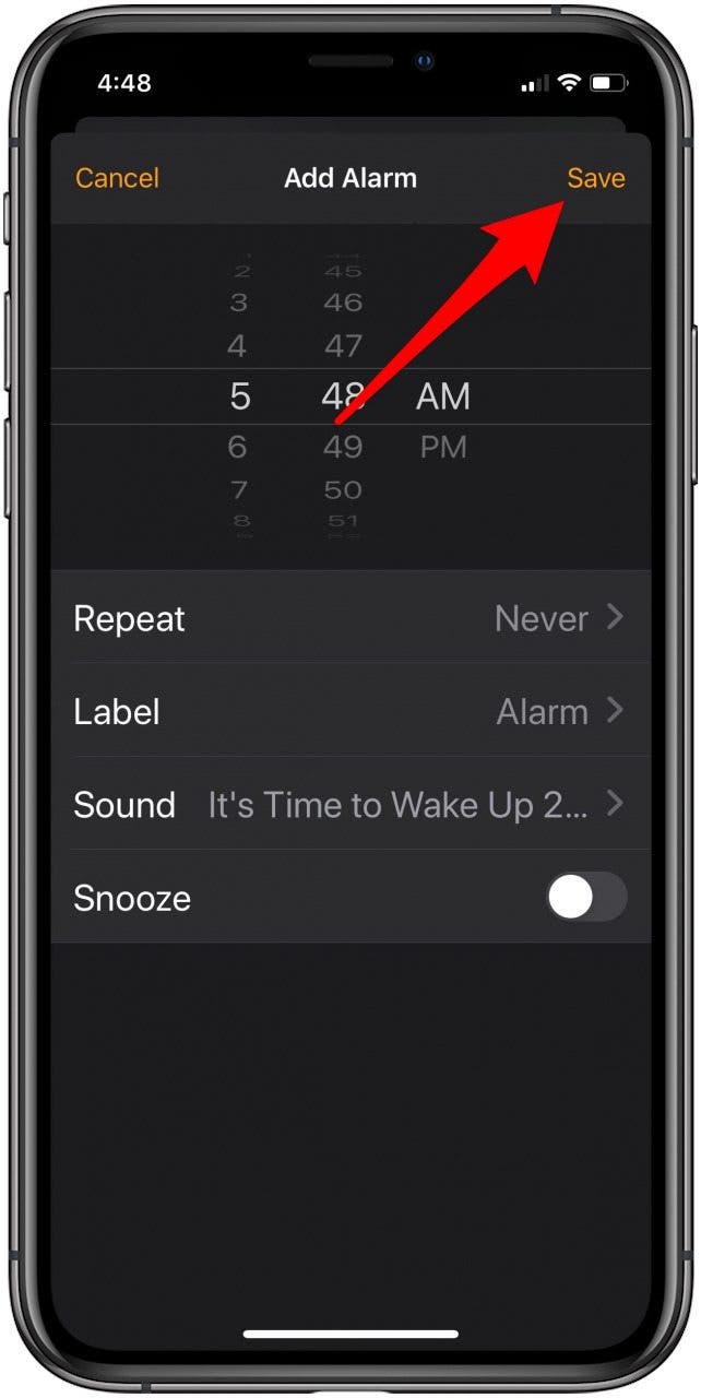 - 轻敲节省在右上角。它将带您返回主页,并且您的闹钟应该已设置。