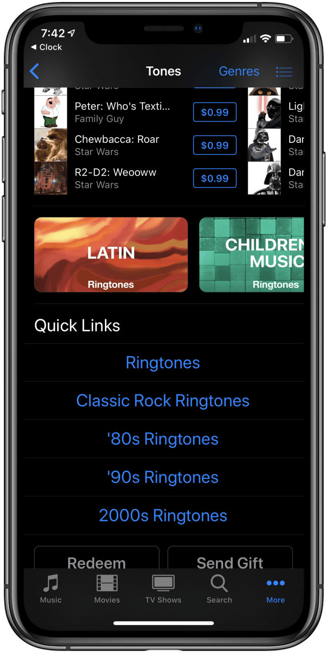 - 在“铃声”页面上,向下滚动以选择要预览和购买的铃声。