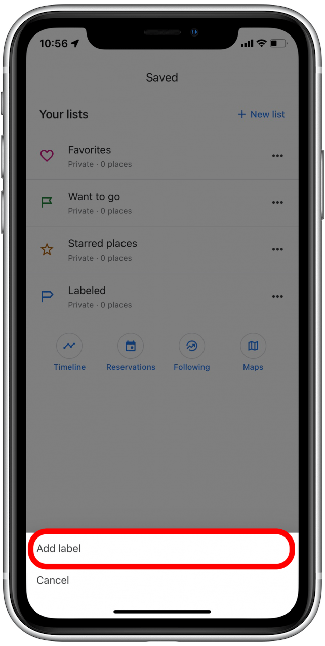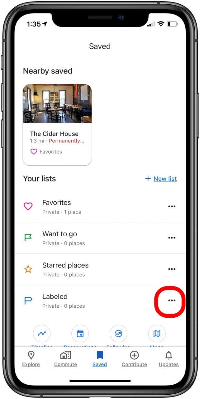 - 现在,您的工作地址将包含在“已标记”选项卡中,并将在地图上用公文包标记。
