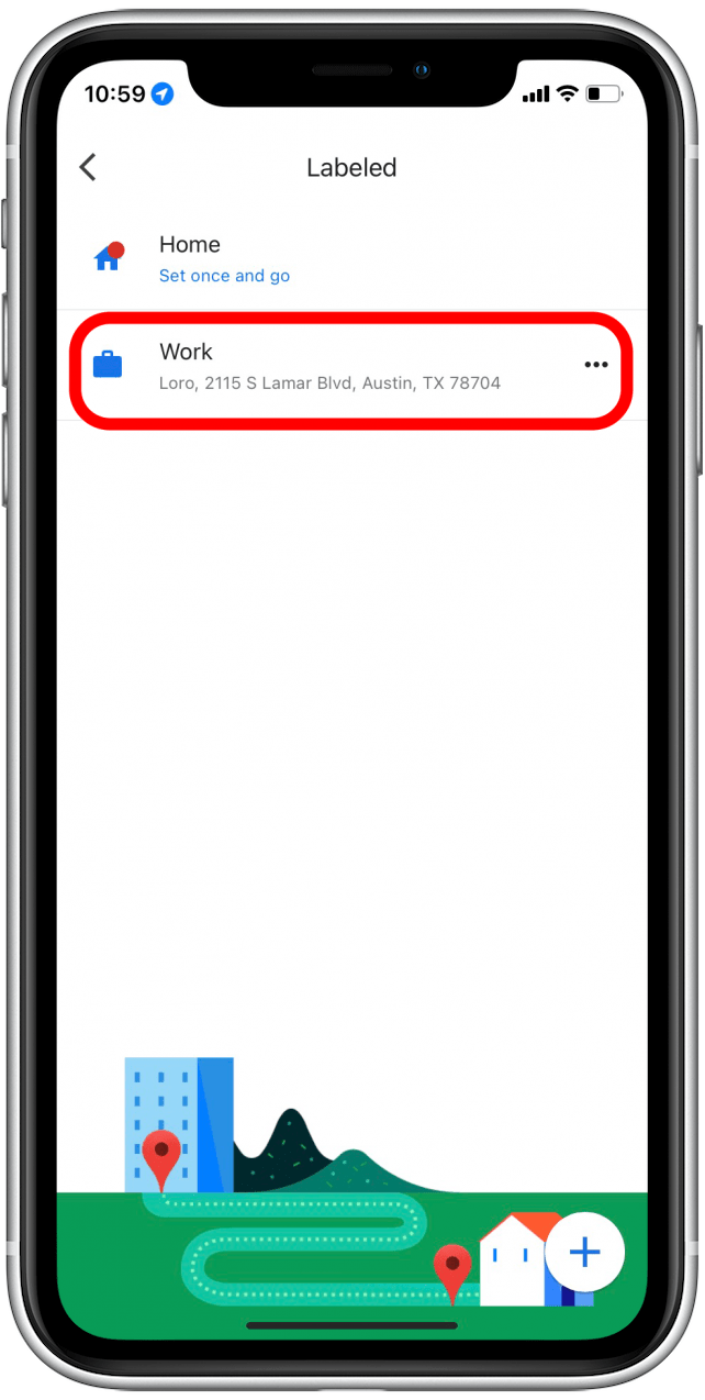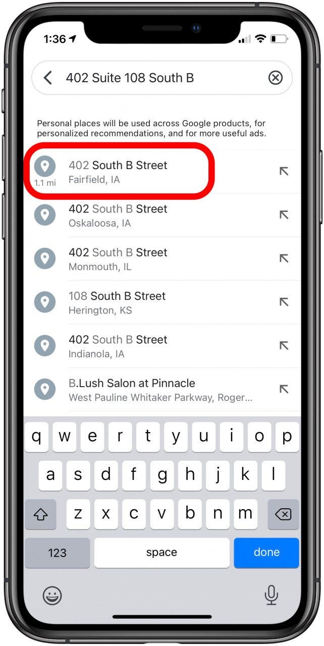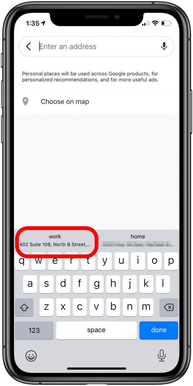- 在此示例中,我输入了工作地址。输入顶部的地址,或点击键盘上方的 Google 建议。