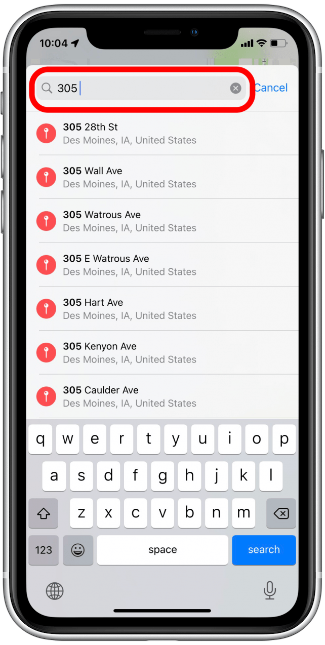 - 如果您在搜索字段中输入地址,应用程序可能会提供以下建议;点击正确的建议或点击完毕手动输入地址后。