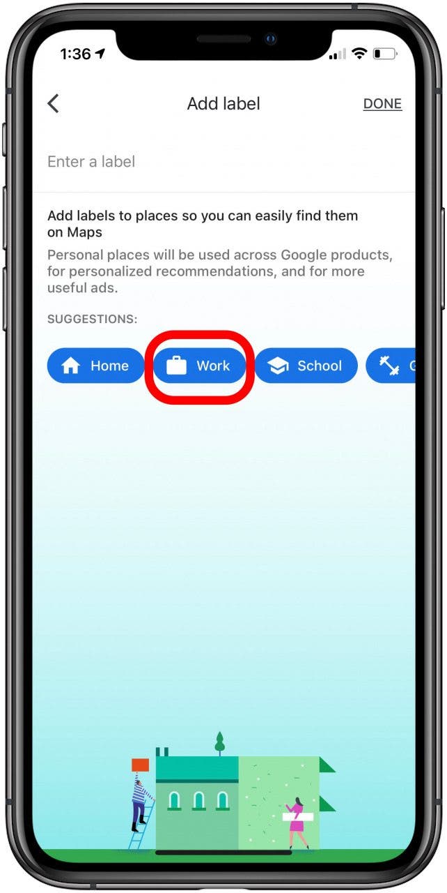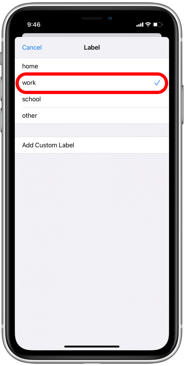 - 这将显示您的标签,并让您可以选择家庭、工作、其他或添加自定义标签。轻敲工作。
