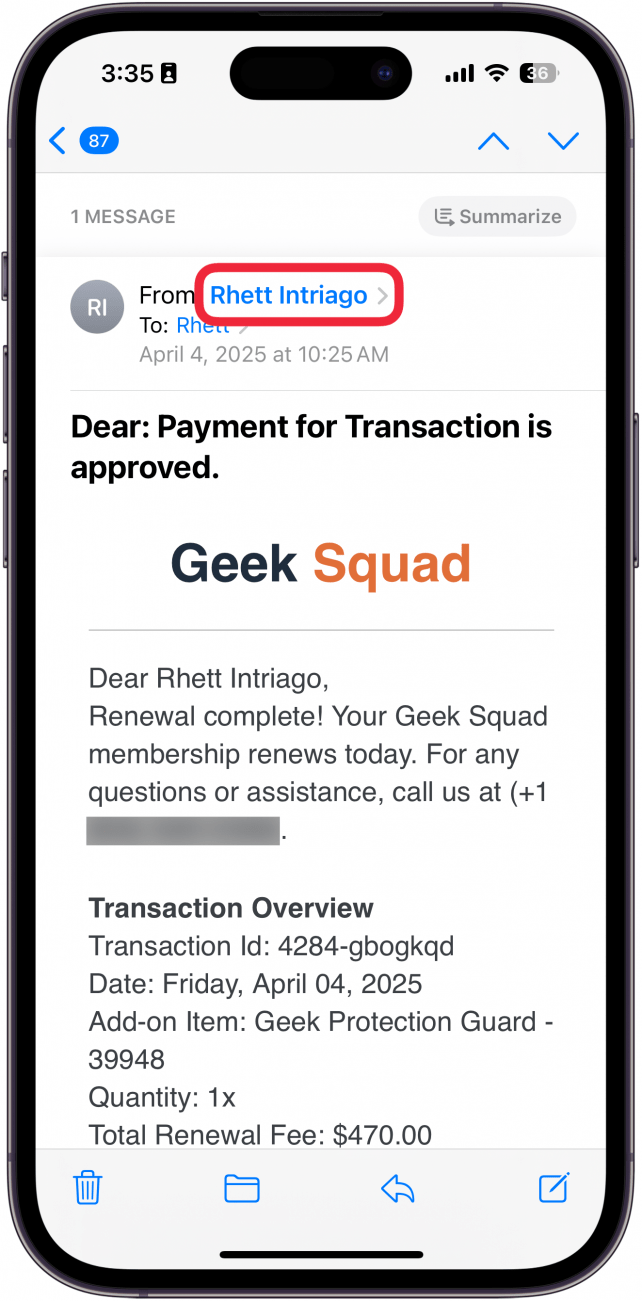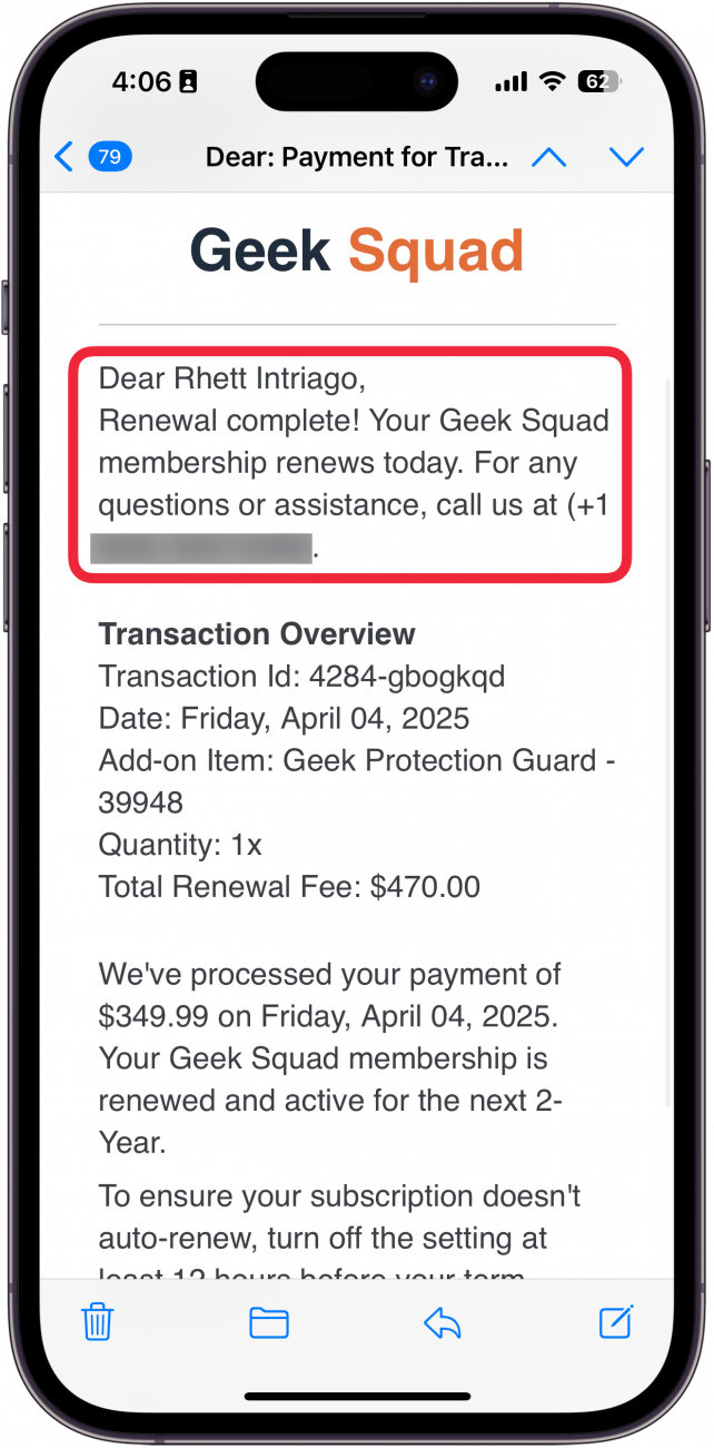 - 另一个明显的迹象是,在电子邮件正文中,“Geek Squad”提供了一个电话号码,供您在需要帮助时拨打。如果您有疑问,可以在网上搜索给出的号码,看看它是否可以追溯到合法来源。
