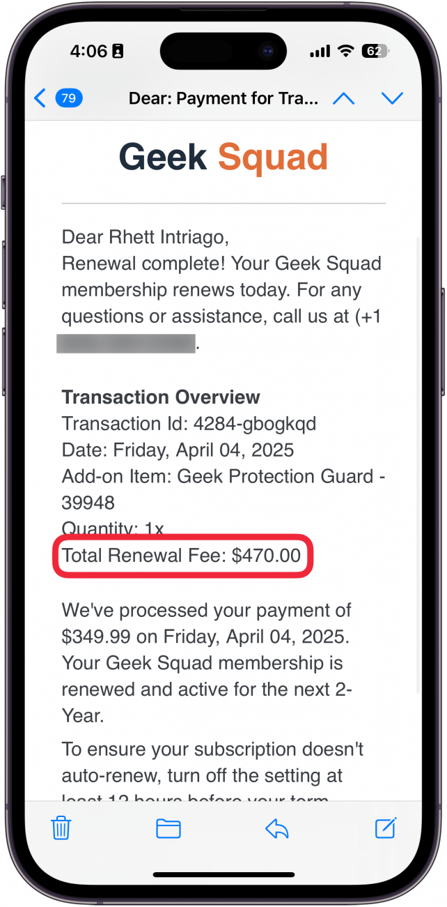 - 该电子邮件还声称我已花费 470 美元续订会员资格。这是一笔惊人的金额,目的是让您感到恐慌并立即拨打电子邮件中指定的电话号码。如果您怀疑该电子邮件是否合法,请勿拨打电子邮件中的电话号码或直接回复电子邮件。请访问该企业的网站,了解如何直接联系客户服务。