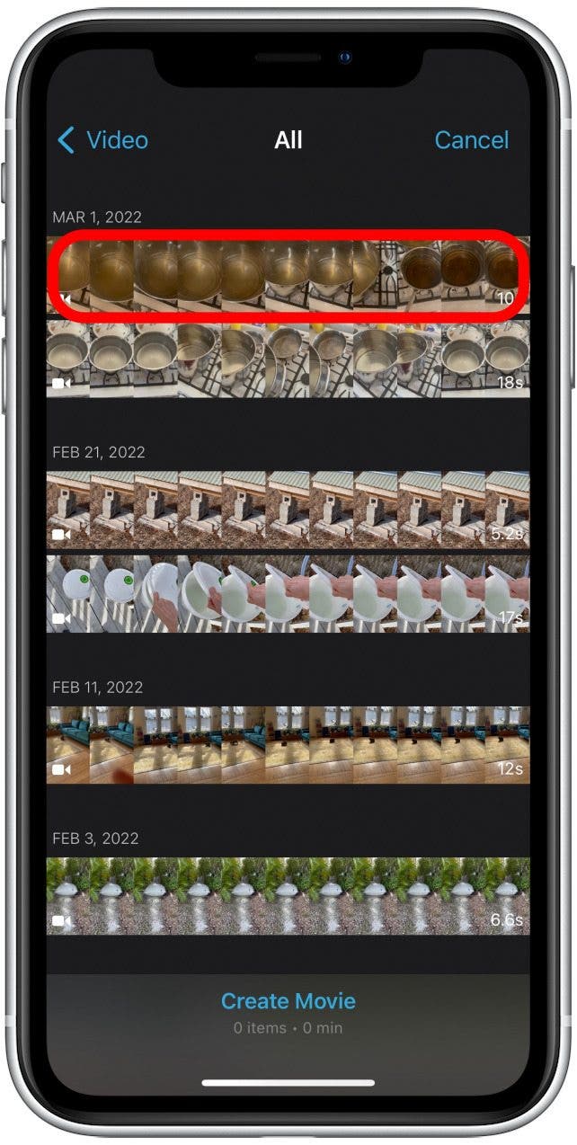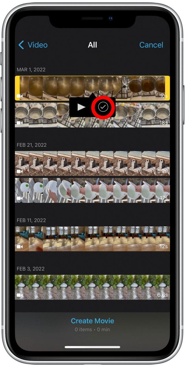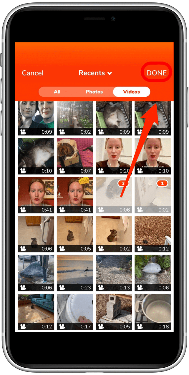 - 一旦获得访问权限,该应用程序将显示您的视频。按照您想要合并在一起的顺序点按要合并的两个或多个视频剪辑。
