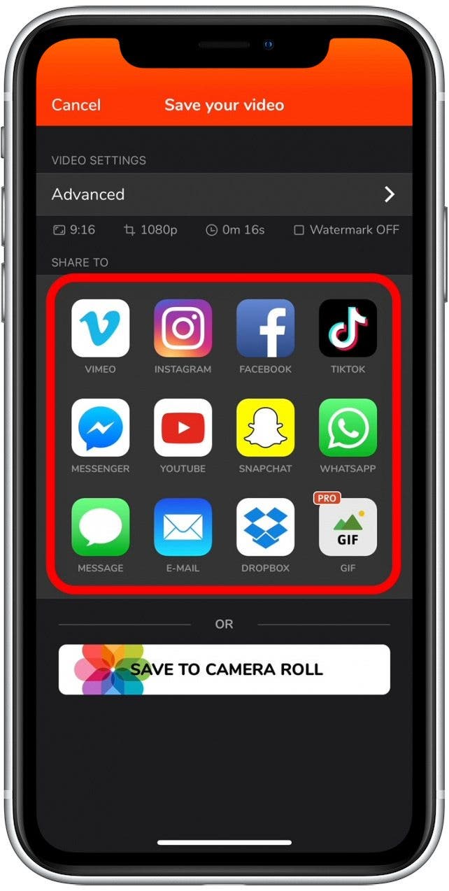 - 要将视频发送给朋友或家人,请点击以选择您喜欢的应用程序。