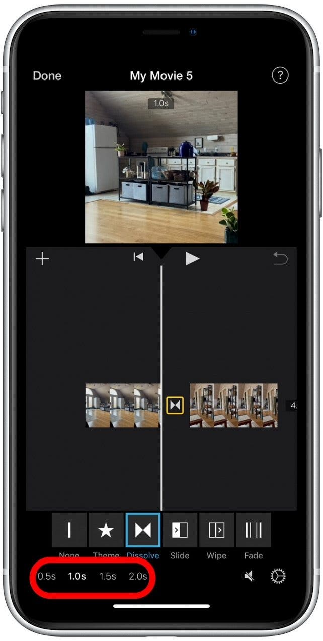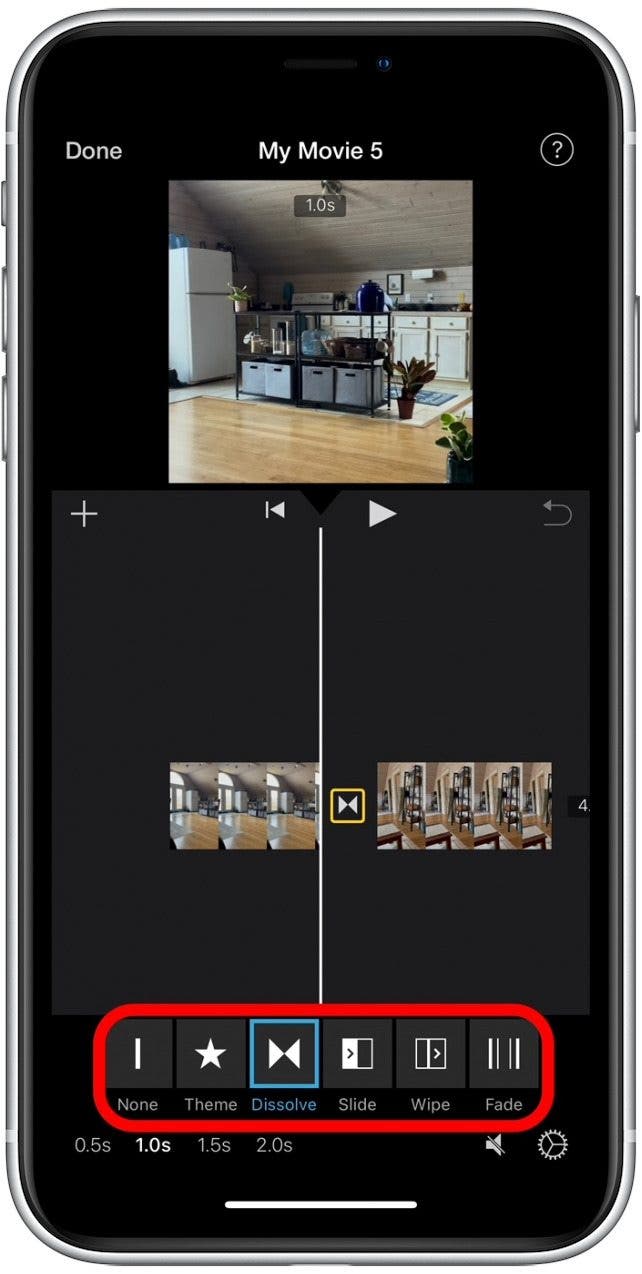- 您的视频剪辑现在将显示为单个文件,每个剪辑之间都有过渡。要调整过渡,请点击过渡图标剪辑之间。