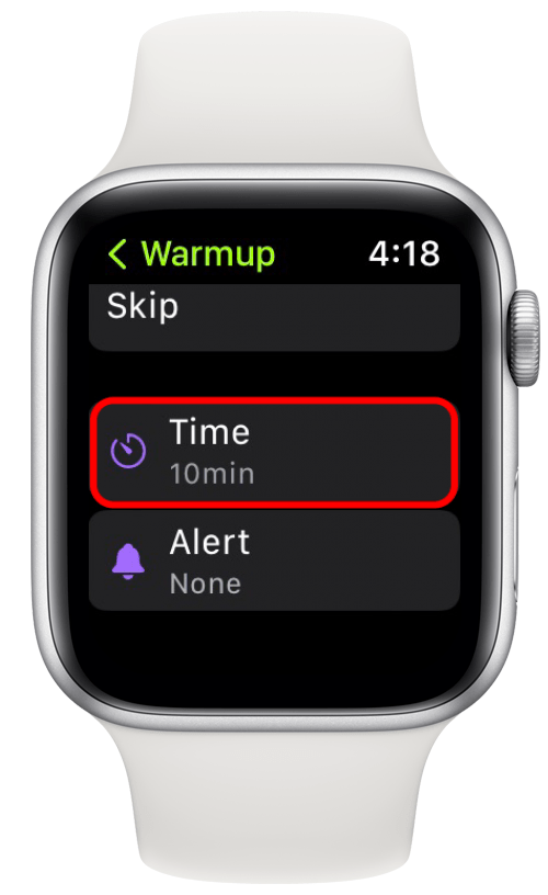 - 如果您选择时间或距离,您可以向下滚动并点击时间或距离来自定义热身的持续时间。