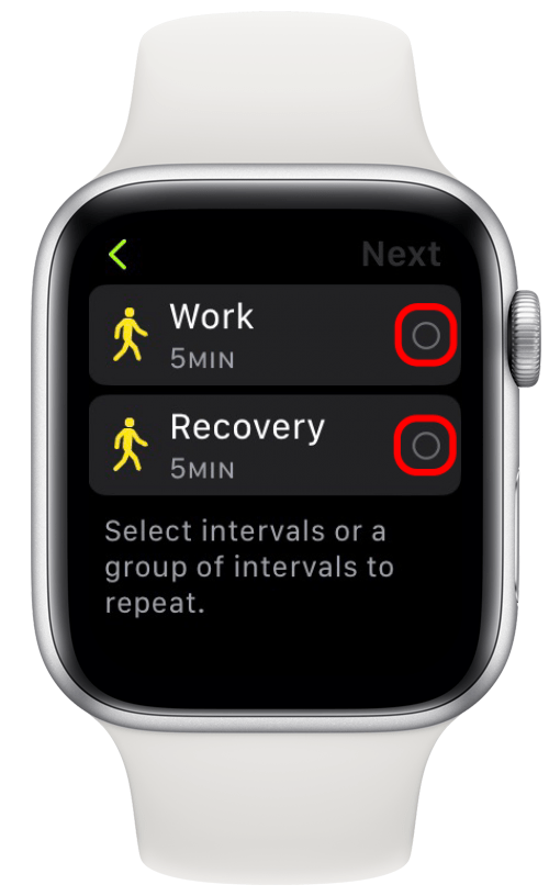 - 在“锻炼自定义”屏幕上,您将看到之前的两个“工作”和“恢复”选择已通过“重复”选项合并在一起,使您的锻炼成为间歇训练。