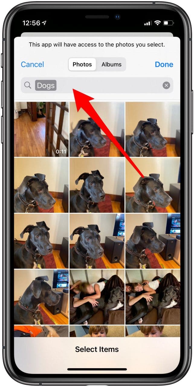 - 现在,您可以选择允许此应用程序访问的单张照片或相册。此外,您可以在屏幕顶部附近的搜索栏中输入文字,以缩小您要选择的照片的范围。例如,我搜索“狗”以将搜索范围缩小到仅我的狗的照片。