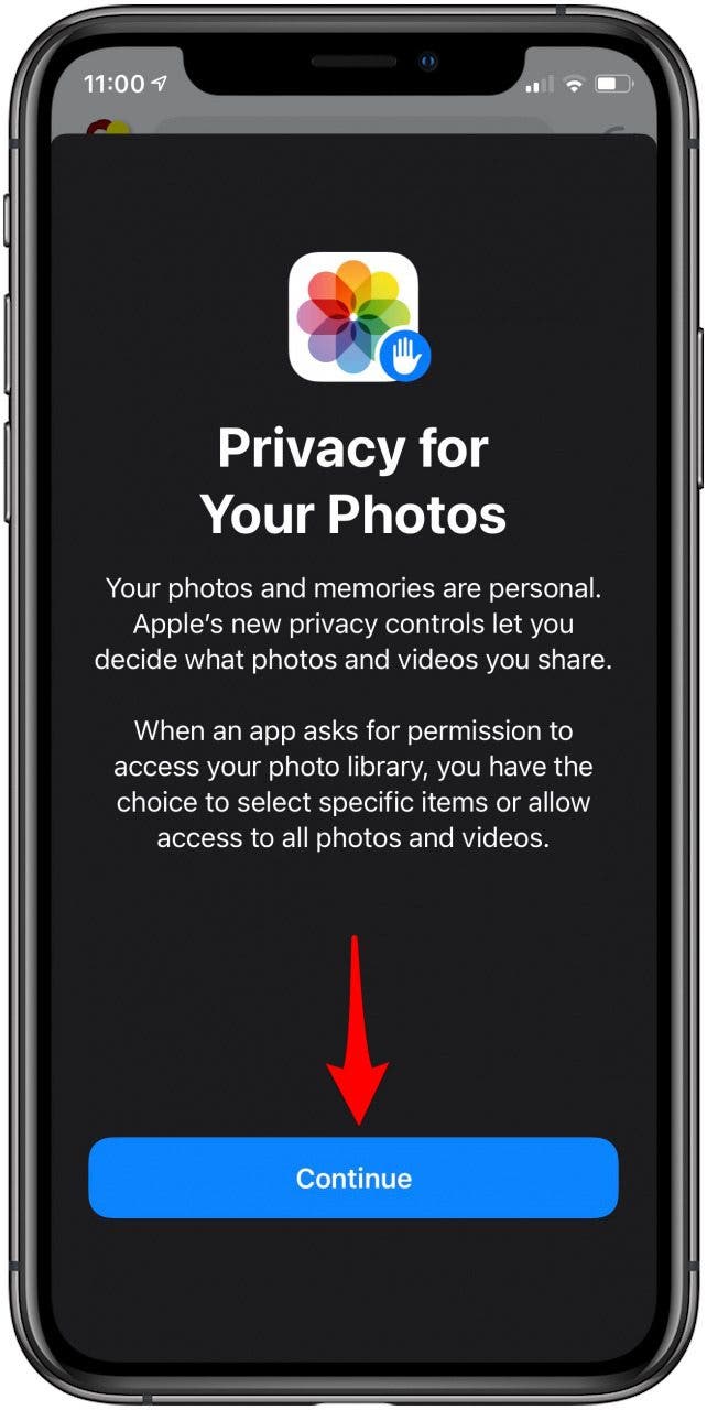 - 最后,系统会询问您有关照片应用程序的访问权限。你会看到您照片的隐私下面有一些解释。点击屏幕底部的蓝色按钮,上面写着继续。