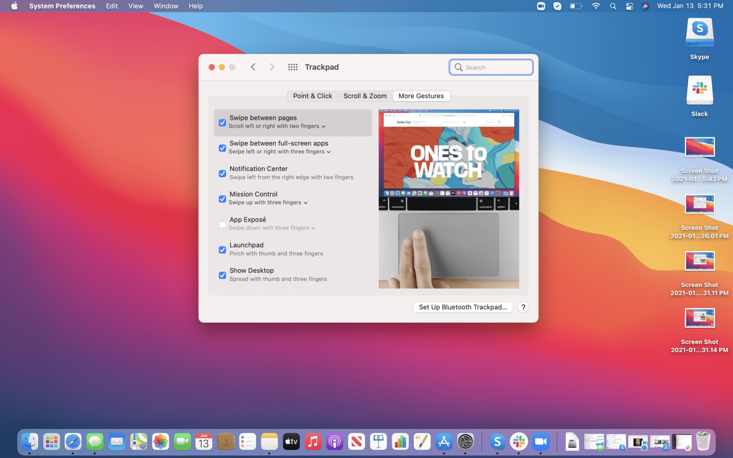 - 通知中心允许您按照说明访问通知中心用两根手指从右侧边缘向左滑动。这有点令人困惑。这并不意味着将光标移至屏幕右侧,然后用两根手指向左滑动,而是从右边缘向左滑动触控板。没有其他手势选项可以实现此目的,只有将其关闭的选项。