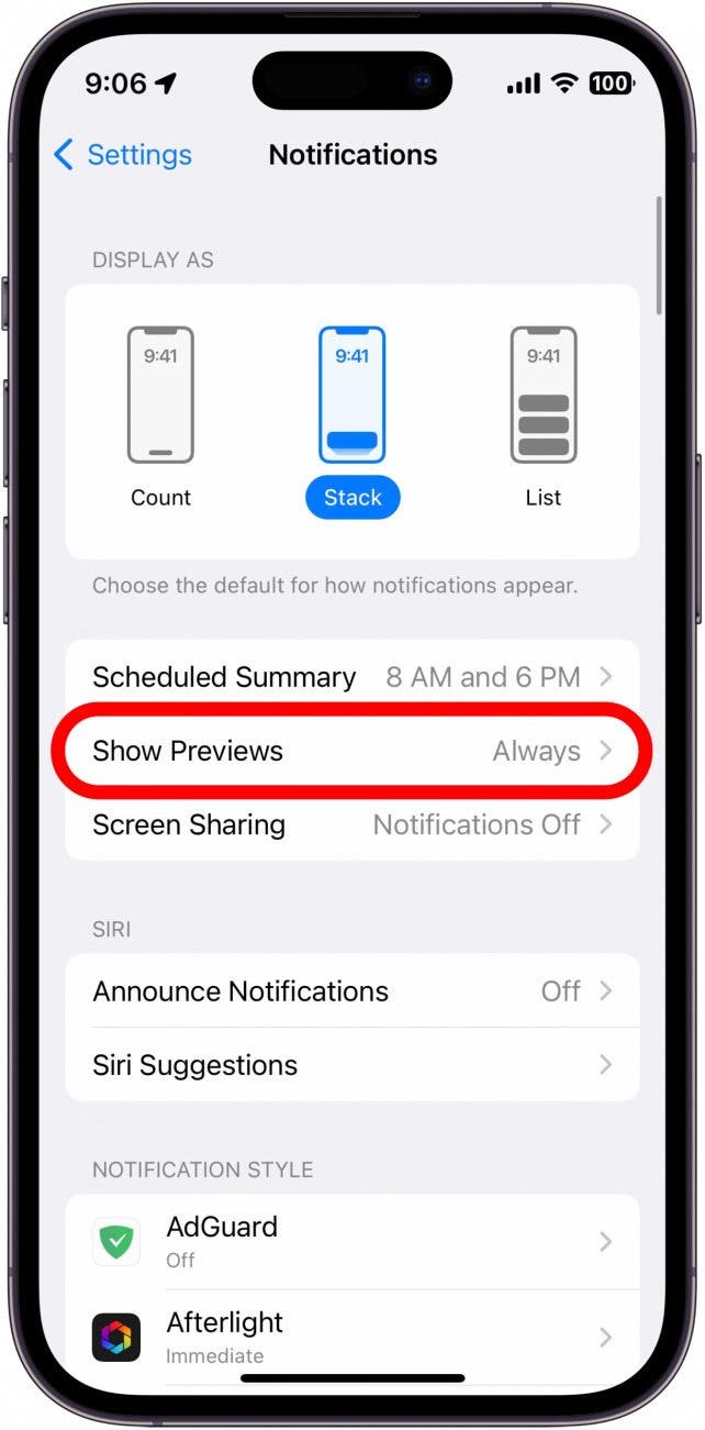 - 向下滚动并点击显示预览选择该特定应用程序是否在锁定屏幕上显示预览。您将拥有与步骤 3 和 4 中相同的选项。
