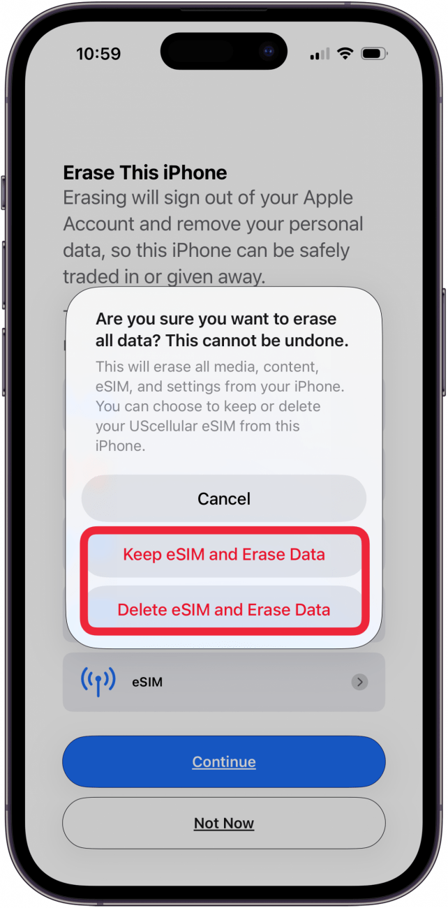 - 如果您的 iPhone 配备 eSIM,请轻点“保留 eSIM 并擦除数据”或“删除 eSIM 并擦除数据”。