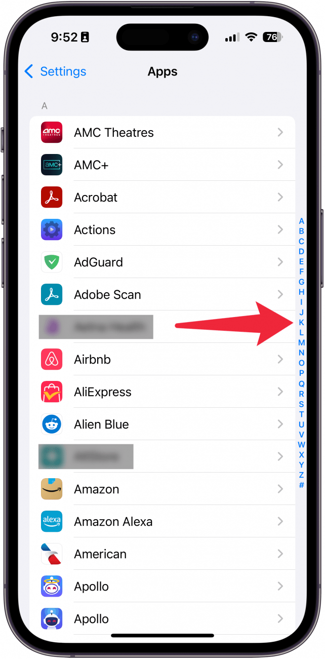 - 您可以滚动浏览应用程序列表以手动查找应用程序或使用字母屏幕右侧可快速跳转到特定应用程序。