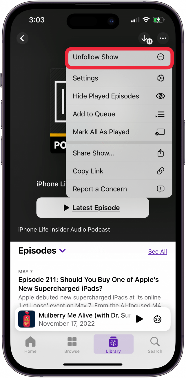 - 要修复某个播客,请取消关注该节目,然后等待几分钟并再次关注该节目。
