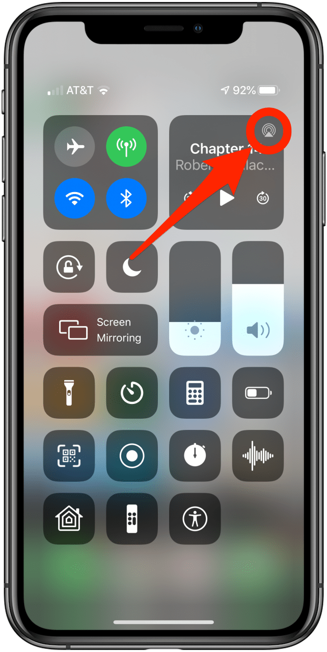 - 打开 AirPlay 菜单,您可以通过点击隔空播放图标此处如图所示在控制中心,但也可以在您的音频播放器应用程序中使用。