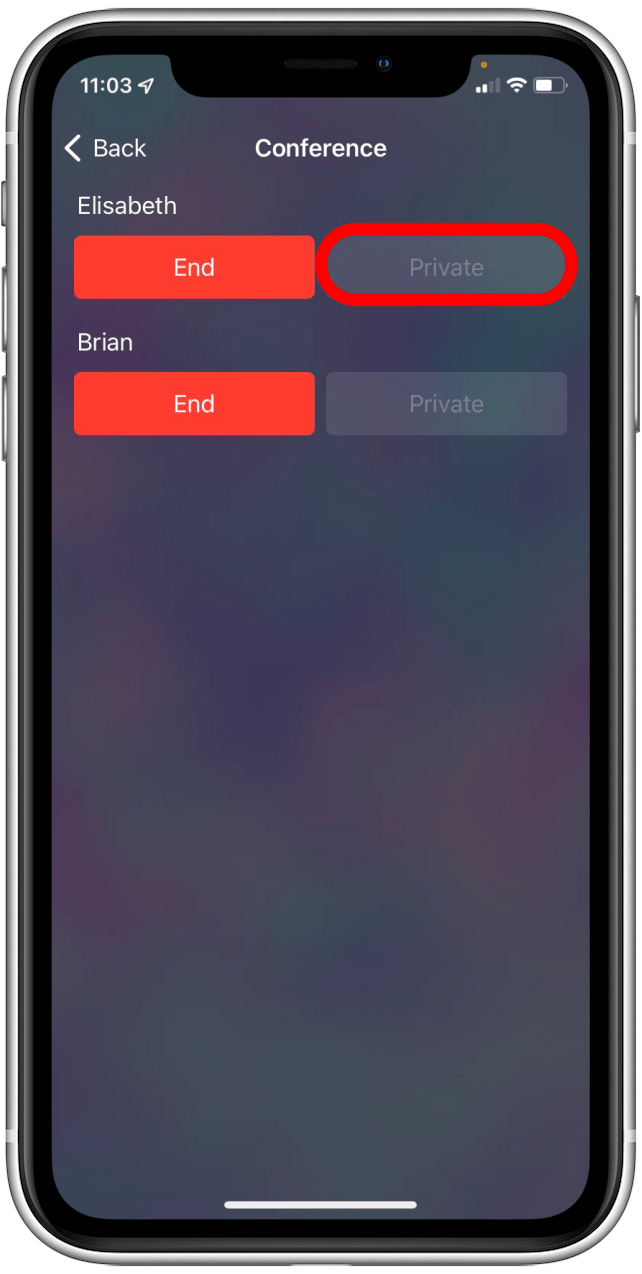 根据您的电话运营商的不同,您可能无法使用在电话会议期间私下交谈的选项。如果该选项可用,请执行以下步骤: