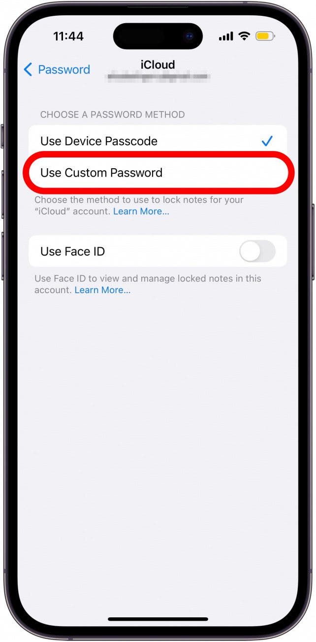 - 如果您已经设置了密码,您将看到下面的屏幕。使用设备密码是默认选项,但您也可以点击使用自定义密码设置唯一的密码。