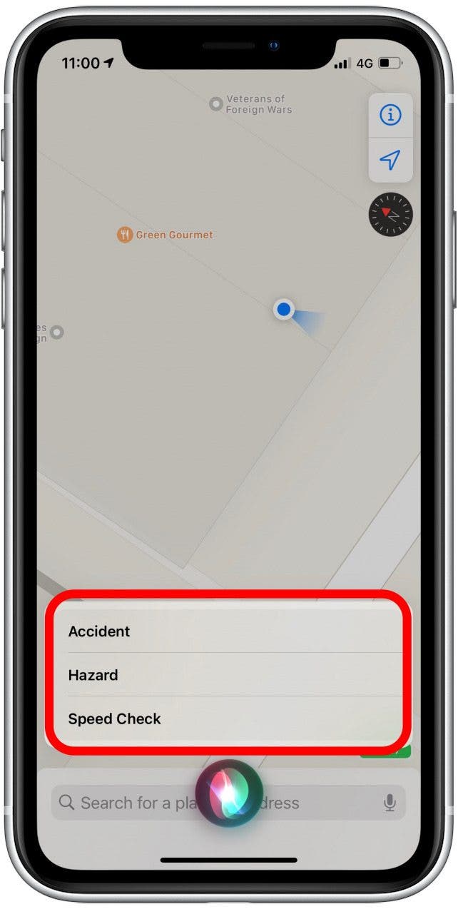 - 为了澄清您的报告,请说“事故,” “冒险,”或者“速度检查”Siri 会将您的报告添加到 Apple 地图(乘客也可以点击下面显示的选项之一)。