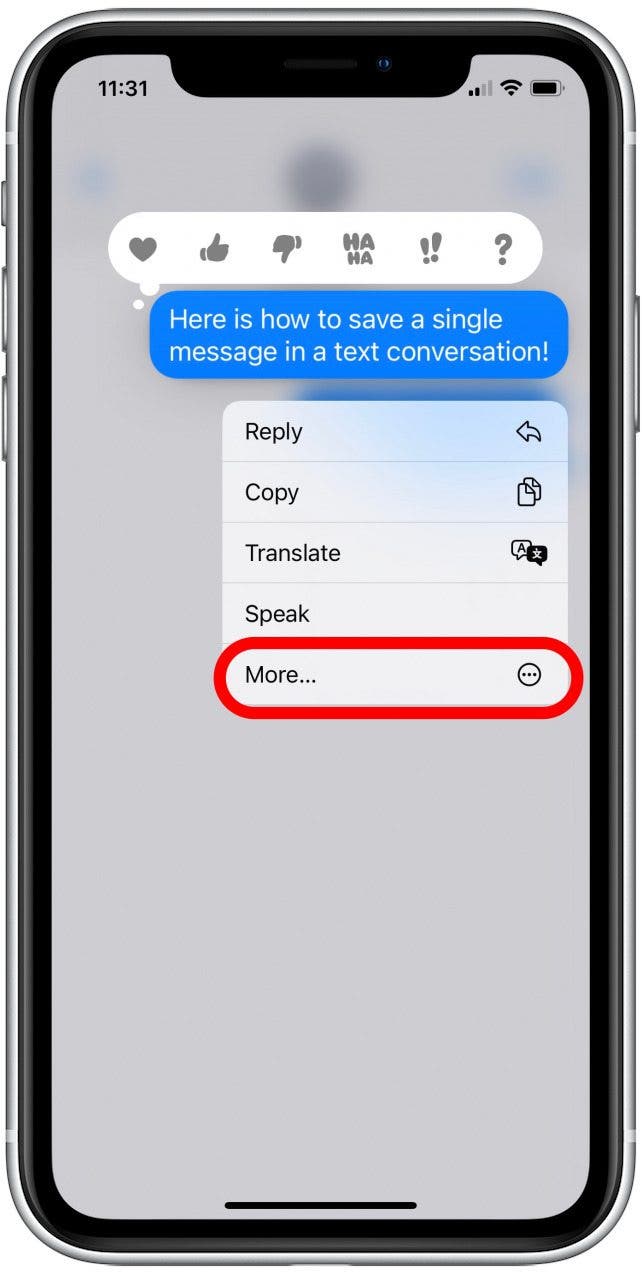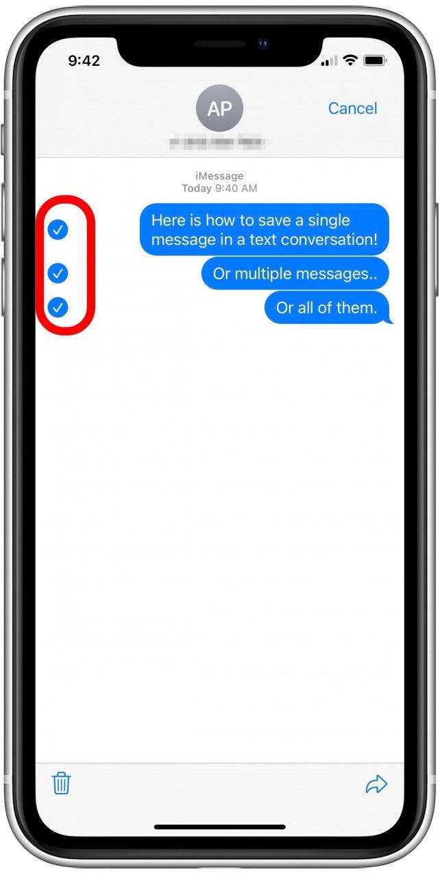 - 点击您要保存的每条短信。 (消息旁边的蓝色气泡表示它已被选中。)