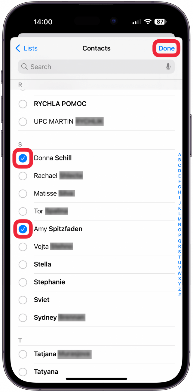 - 您现在将看到您选择的联系人。如果您想删除意外添加的人,请点击减 图标,然后它们就会消失。