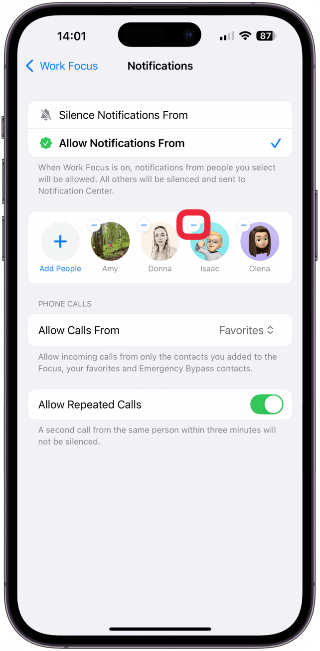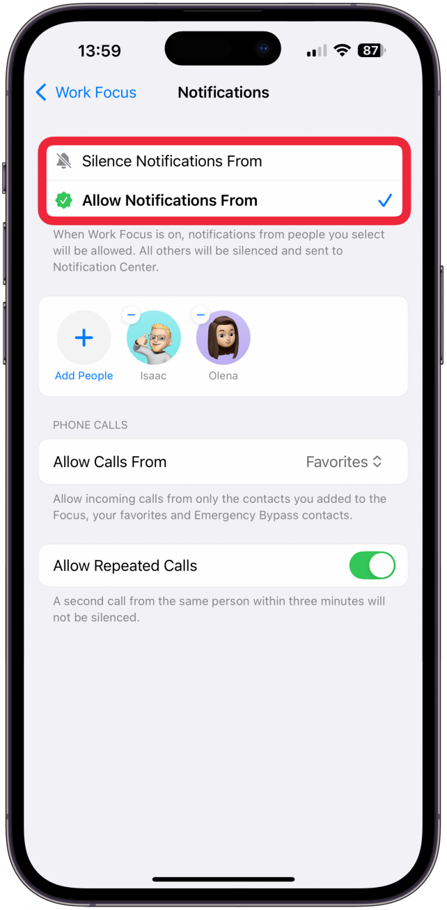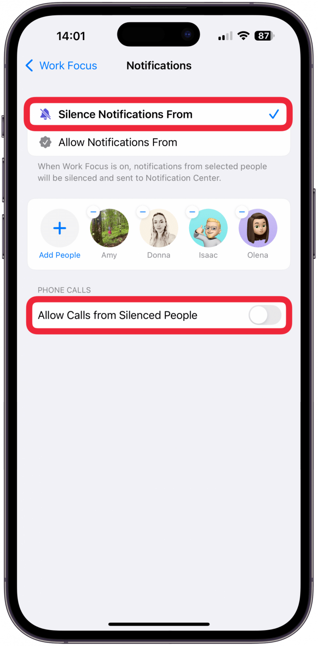 - 根据您决定静音还是允许通知,您将看到用于自定义电话呼叫权限的不同选项。如果您选择了静音通知,您可以切换允许静音的人拨打电话打开或关闭。