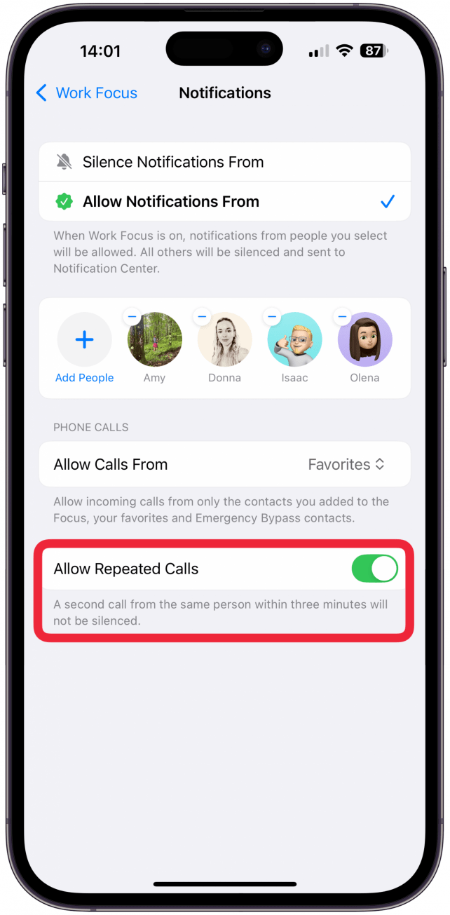 - 在其下方,如果您愿意,可以切换允许重复呼叫,这意味着有人第一次来电时您不会收到通知,但如果他们在三分钟内再次回电,第二次来电将不会被静音。我建议打开此功能,以便在紧急情况下有人可以联系到您。