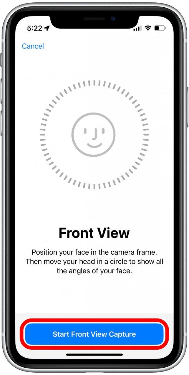 - 此过程类似于设置 Face ID,因为您的手机将使用前置摄像头捕获您的脸部正面以及每只耳朵的扫描。轻敲开始前视图捕捉开始。您需要将脸部的正面放置在框架中。